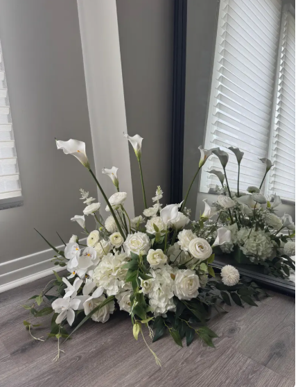 Floor background flower Wedding Pastel wildflower ground arch arrangement Suitable for: -Bride/Groom Corner -Wedding Aisle -Sweetheart Table Ground Arch Length: 2'x 5 pieces Width: 14-16" Height: 18-22"